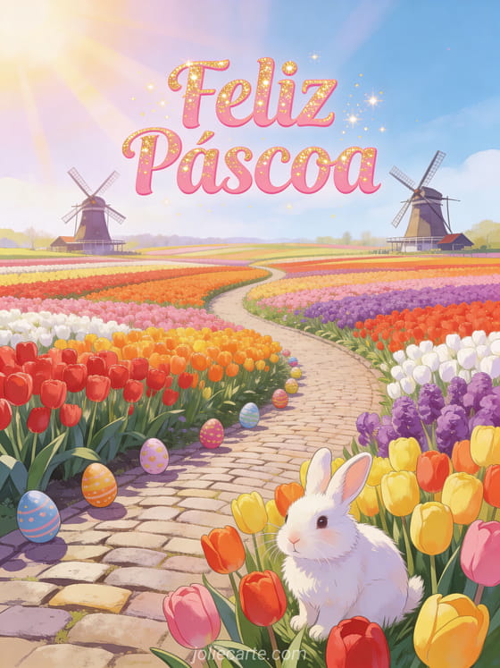 Celebre a Páscoa com este encantador cartão animado gratuito com uma vista panorâmica dos campos de tulipas de Keukenhof com fileiras de tulipas multicoloridas, dois moinhos holandeses, ovos de Páscoa e um coelho branco. Descubra também joyeuses paques image carte virtuelle paques.