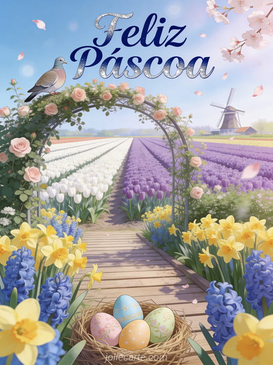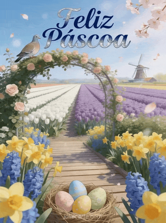 Celebre a Páscoa com este encantador cartão animado gratuito com uma rola descansando em um arco de jardim coberto de rosas em Keukenhof com campos de tulipas brancas e violetas, ovos de Páscoa em um ninho e um moinho holandês. Descubra também gifs joyeuses paques images gratuites joyeuses pâques.