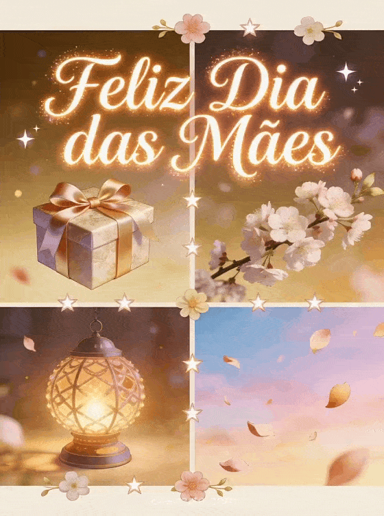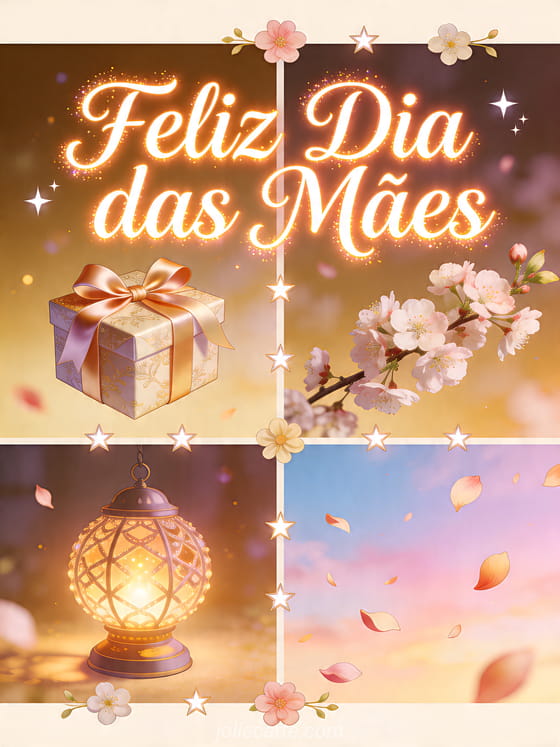 Compartilhe cartões virtuais gratuitos para o Dia das Mães com uma colagem ilustrada de quatro painéis: presente com fitas, flores de primavera, lâmpada decorativa, céu pastel e pétalas flutuantes. Veja também desejar feliz Dia das Mães para sua mãe, citações do Dia das Mães ou mensagem para o Dia das Mães.