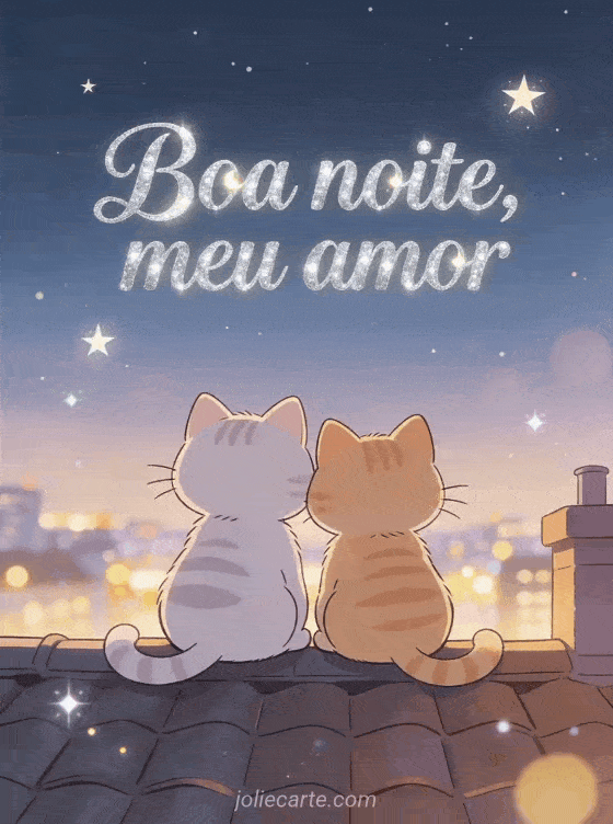 Deseje uma noite carinhosa com este cartão romântico de dois gatos sob as estrelas. Veja também mensagem de amor romântica boa noite, imagem boa noite meu amor ou mensagem para desejar boa noite ao meu amor.