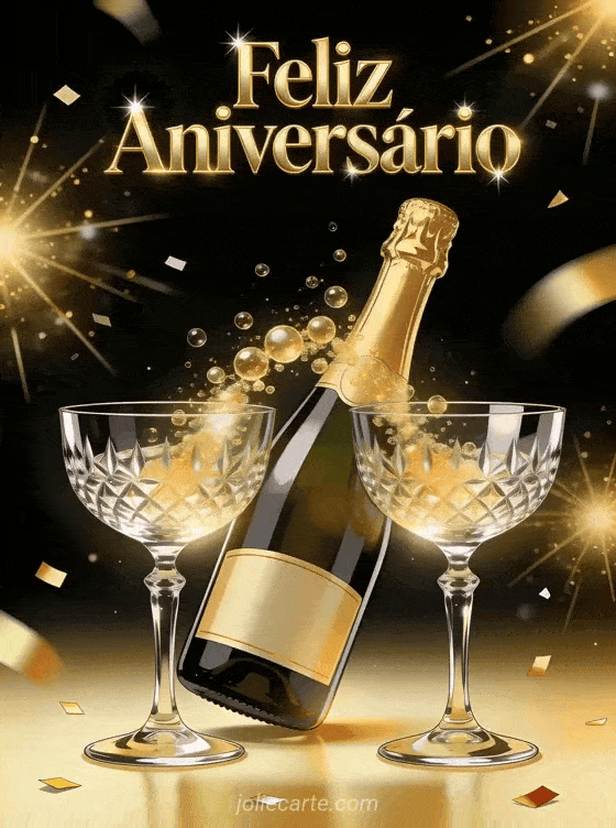 Celebre um aniversário com estilo com este luxuoso cartão que mostra uma elegante garrafa de champanhe com duas taças de cristal, bolhas douradas subindo, um fundo preto com flashes de luz dourada e confetes. Descubra também um cartão de aniversário com saxofone ou um cartão de aniversário romântico.