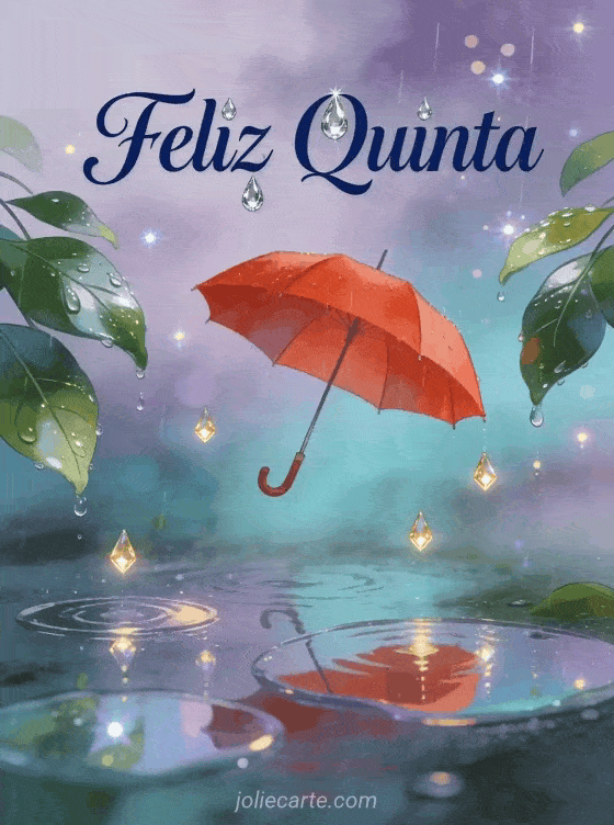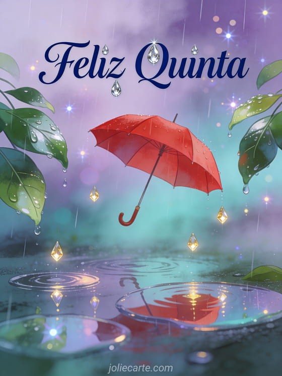 Compartilhe um caloroso desejo de feliz quinta-feira com este cartão mágico com um guarda-chuva vermelho entre gotas de chuva brilhantes. Descubra também feliz quinta-feira beijos ou imagem feliz quinta-feira zen para mais inspiração de quinta.
