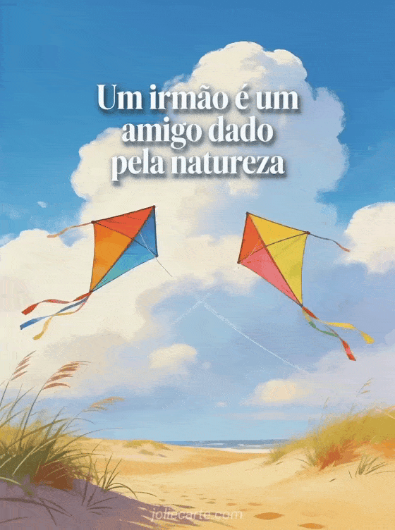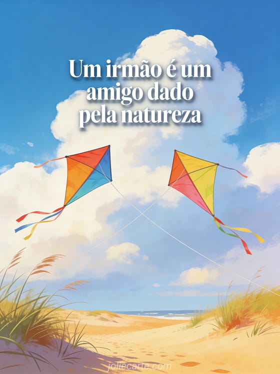 Compartilhe uma citação carinhosa de aniversário para irmão com duas pipas coloridas voando lado a lado em um céu azul de verão sobre areia dourada e capim das dunas. Você também pode enviar um meu irmão feliz aniversário mano humor, um feliz aniversário irmãozinho ou um aniversário irmãozinho.