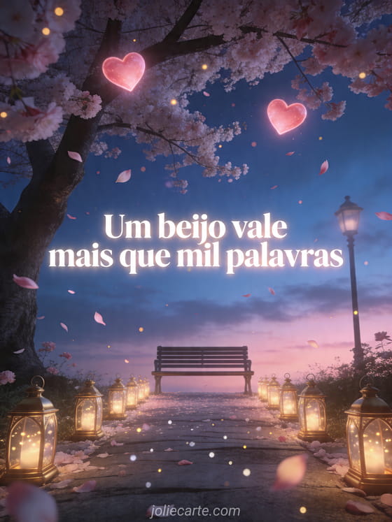 Celebre o amor com este cartão grátis com citação de beijo inspirado em luz de lanternas, flores de cerejeira e um caminho de sonho ao entardecer. Veja também página beijo carinhoso, ternura coração beijos boa noite ou imagem beijos carinhosos.