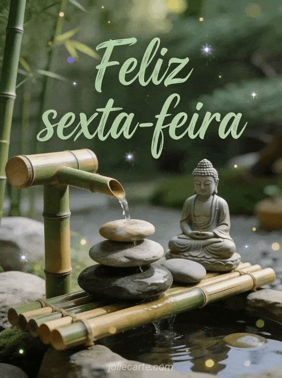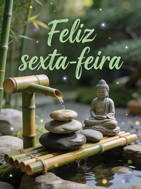 Compartilhe uma saudação tranquila de feliz sexta-feira com caligrafia verde-sálvia, uma fonte de bambu, pedras lisas de rio e uma pequena estátua de Buda em clima de jardim de meditação. Veja também um cartão de feliz sexta-feira e bom fim de semana, uma imagem de feliz sexta-feira com beijos ou um cartão de boa sexta-feira.