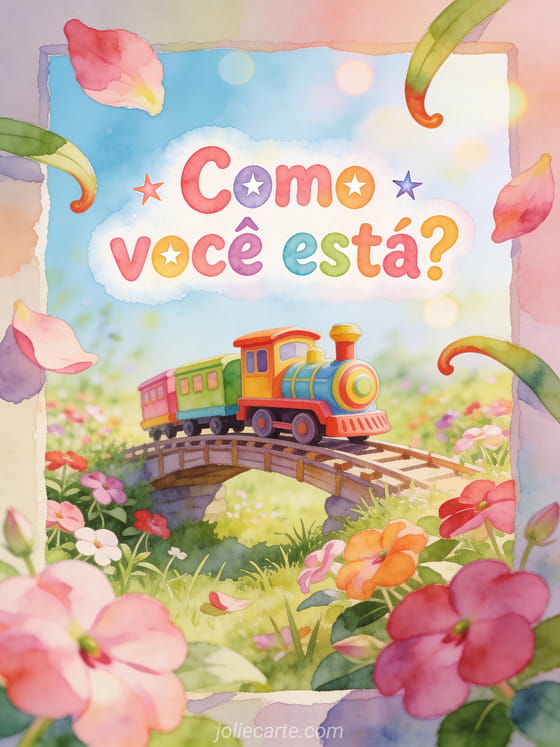 Envie uma saudação divertida com letras arredondadas em aquarela, um trem de brinquedo colorido atravessando uma pequena ponte na campina e pétalas de impatiens saindo da borda. Veja também um oi minha querida como você está, um cartão de como você está minha filha ou uma saudação de olá como vai hoje.