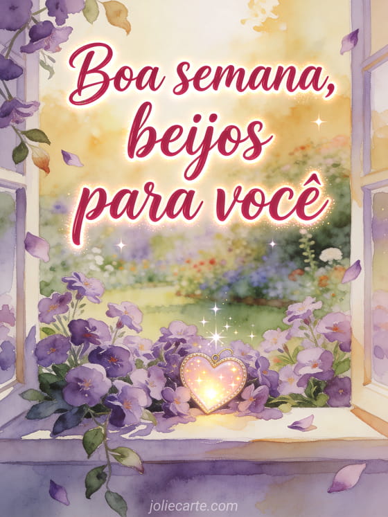 Compartilhe uma mensagem suave de boa semana com caligrafia carmesim, um coração luminoso, violetas e luz quente de jardim. Veja também belas imagens boa semana beijos, beijos carinho boa semana ou boa semana a todos beijos imagens.