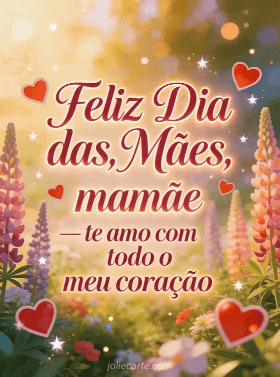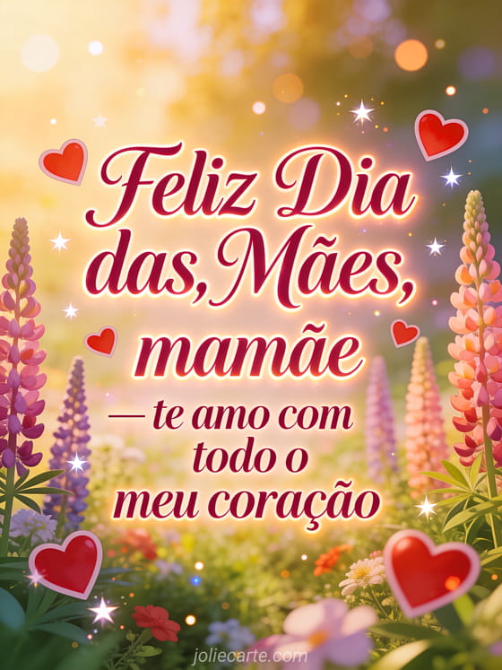Diga à mamãe que a ama com todo o coração com este lindo cartão de coração para o dia das mães com escrita em rosa profundo e tremoços num jardim de sonho. Descubra também cartões feliz dia das mães ou cartão para o dia das mães.