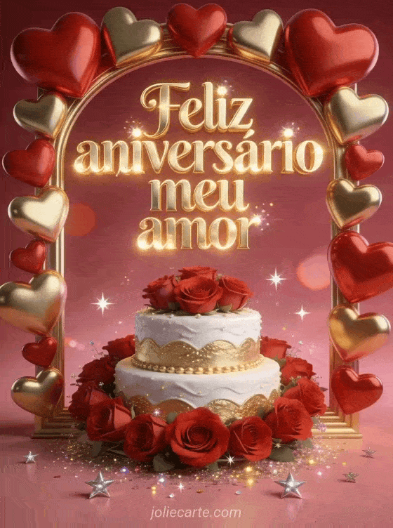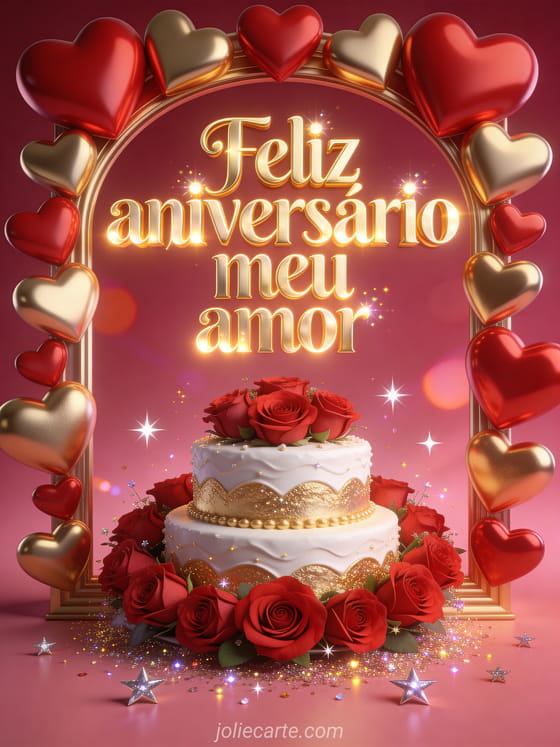Celebre o aniversário da pessoa amada com este cartão elegante de corações, rosas e bolo. Você também pode ver mensagem aniversário para meu amor, cartao aniversario querido e cartão feliz aniversário meu amor.