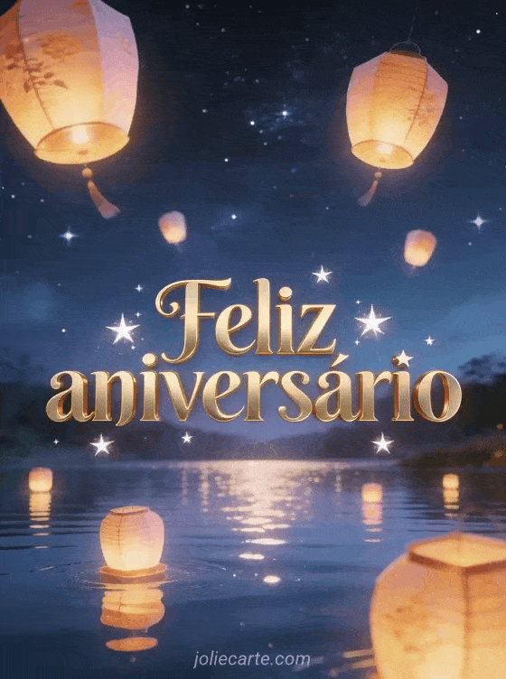 Compartilhe um desejo de aniversário especial com esta cena fotorrealista de lanternas flutuantes, reflexos no lago e céu estrelado. Você também pode ver feliz aniversário gato fofo, feliz aniversário gif grátis e feliz aniversário na água.