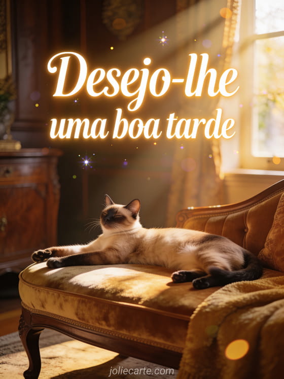 Envie este elegante desejo de boa tarde com um doce gato siamês se espreguiçando luxuosamente numa chaise longue de veludo à luz da tarde. Descubra também um cartão boa tarde imagem ou um cartão boa tarde chuva.