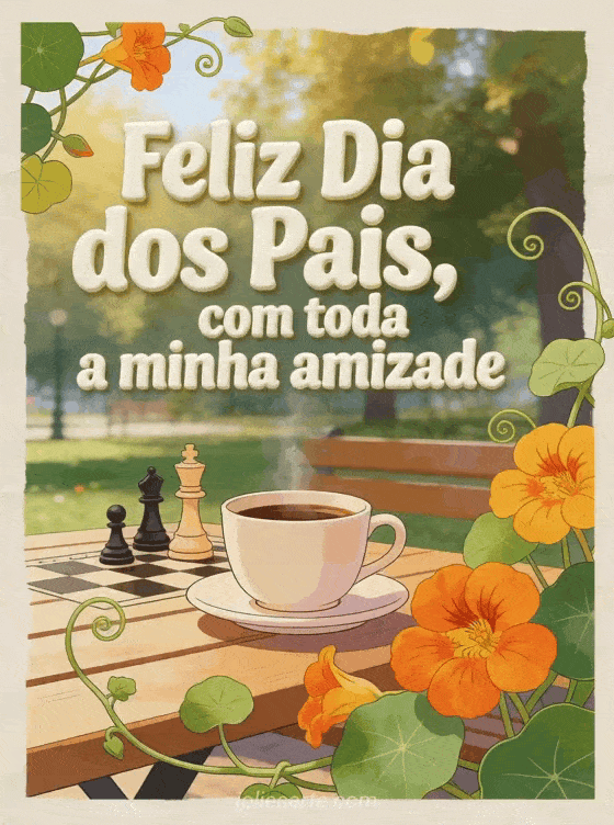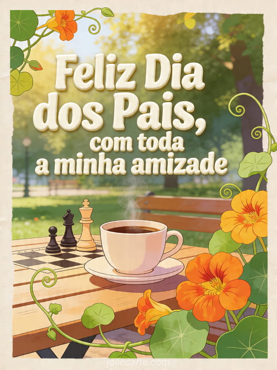 Compartilhe um cartão ilustrado e amigável de Dia dos Pais com uma mesa ensolarada no parque, xícara de café fumegante, peças de xadrez e ramos vivos de capuchinha sobrepondo a borda da imagem. É uma forma calorosa de enviar amizade e bons desejos. Veja também gif original de Dia dos Pais, meu amor meu querido feliz Dia dos Pais ou feliz Dia dos Pais a todos.