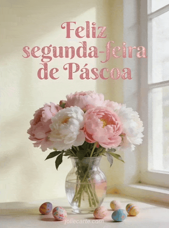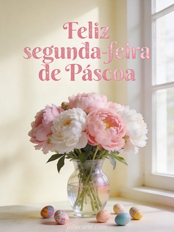 Deseje uma feliz segunda-feira de Páscoa com este delicado cartão com um buquê de peônias em um vaso de vidro e ovos de Páscoa decorados em suaves tons pastel. Descubra também um imagem de segunda-feira de Páscoa, cartão de fim de semana de Páscoa ou saudação de fim de semana de Páscoa.