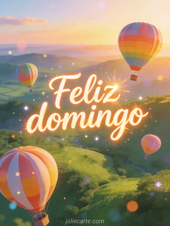 Deseje um feliz domingo com balões de ar quente coloridos flutuando sobre um vale verde ao nascer do sol, cheios de aventura e luz. Compartilhe mais alegria de domingo com bom domingo de junho, bom domingo amizade imagens ou bom dia oi bom domingo.