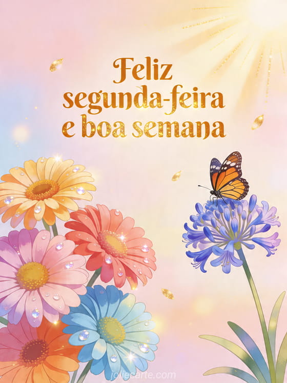 Envie uma luminosa mensagem de segunda-feira e boa semana com este radiante cartão de gérberas coloridas, um agapanto e uma borboleta monarca. Você também pode descobrir bom dia feliz segunda-feira bom dia boa semana, imagens café boa segunda-feira ou foto feliz segunda-feira.