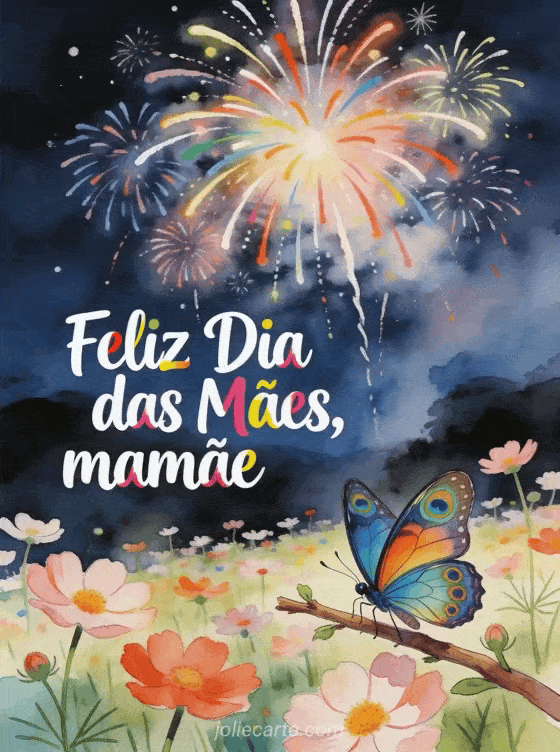 Envie este cartão criativo desenhado à mão para o Dia das Mães com fogos de artifício e borboleta num jardim de cosmos. Veja também dia das mães cartões grátis ou feliz dia das mães.