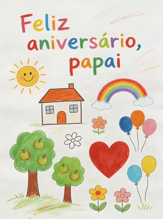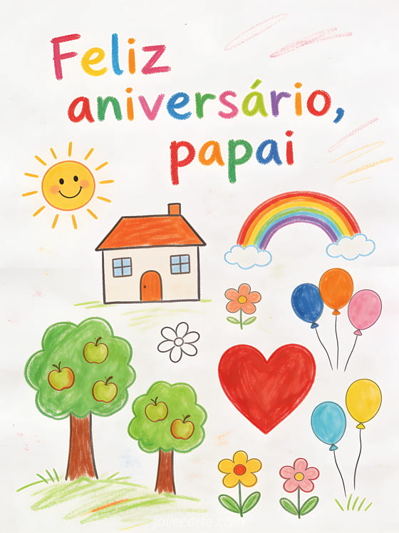 Compartilhe um cartão desenho de criança aniversário papai com letras coloridas em lápis de cor, uma casinha, sol sorridente, árvores com maçãs, arco-íris, flores, balões e um grande coração vermelho. Veja também um feliz aniversário papai imagem, um sua filha feliz aniversário papai ou um feliz aniversário papai eu te amo.