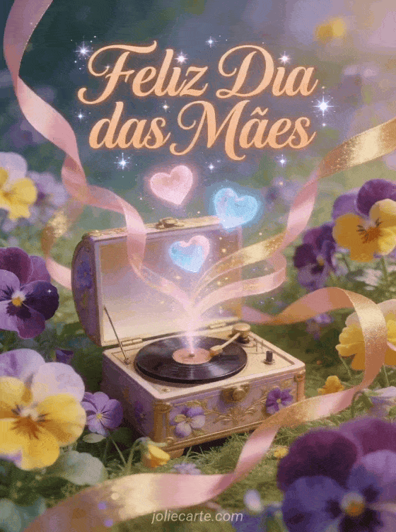 Compartilhe um desenho do Dia das Mães com caligrafia em tom de damasco, poeira de estrelas e uma campina encantada de amores-perfeitos ao redor de uma caixa de música aberta. Com fitas em movimento e corações luminosos, este cartão cria uma celebração sonhadora. Veja também fotos para o Dia das Mães, imagens do Dia das Mães ou elogio para o Dia das Mães.