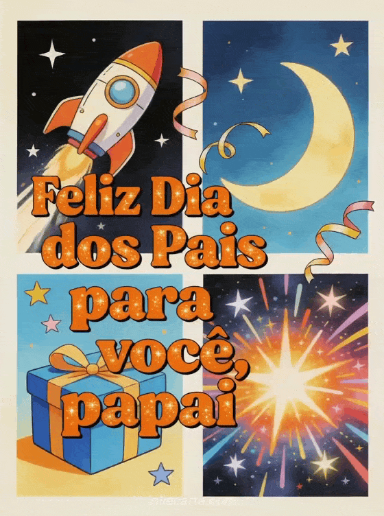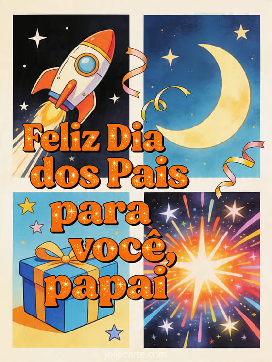 Envie ao papai um cartão ilustrado e brincalhão de Dia dos Pais com um foguete retrô, lua crescente, caixa de presente azul e um céu estrelado cheio de explosões coloridas. Este design enérgico é perfeito para uma mensagem alegre. Veja também poesia feliz Dia dos Pais papai bondade e ternura, cartão Dia dos Pais papai ou cartão gratuito de Dia dos Pais.