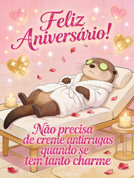 Envia este hilariante cartão de aniversário com uma adorável lontra de roupão de spa com rodelas de pepino nos olhos. Descobre também um cartão aniversário divertido com gato ou um cartão aniversário humor mulher.