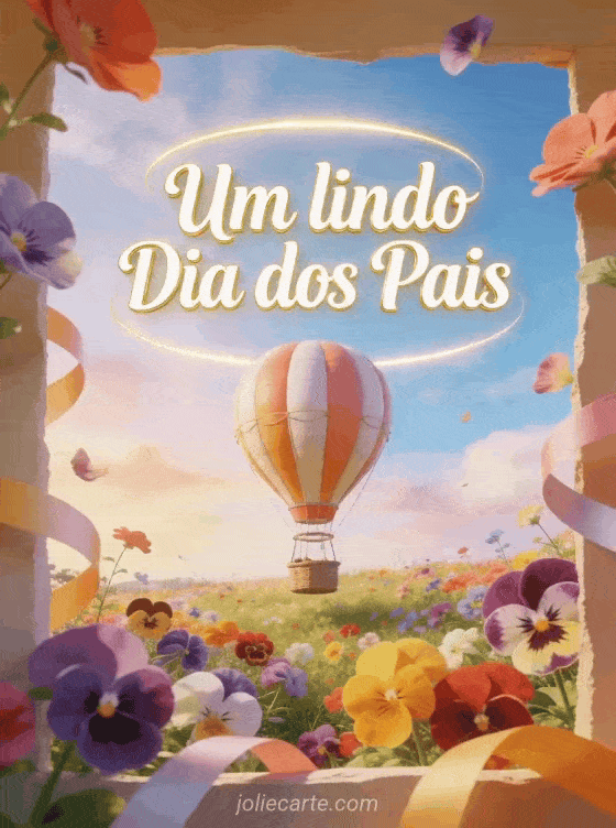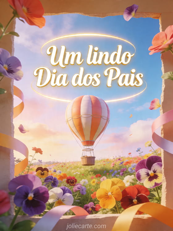 Envie uma saudação alegre de Dia dos Pais com um balão de ar quente ilustrado flutuando sobre uma campina colorida cheia de amor-perfeito, fitas e cores suaves do céu. Veja também um cartão de Dia dos Pais PS, parabéns dia dos pais ou uma citação curta Dia dos Pais.