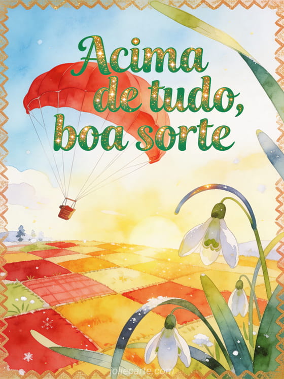 Envie e acima de tudo boa sorte gif com letras esmeralda, um paraquedas vermelho brilhante sobre uma paisagem ensolarada de retalhos, flores de floco-de-neve e folhas curvas. Veja também boa sorte imagens, e então acima de tudo boa sorte gif ou uma imagem animada boa sorte.