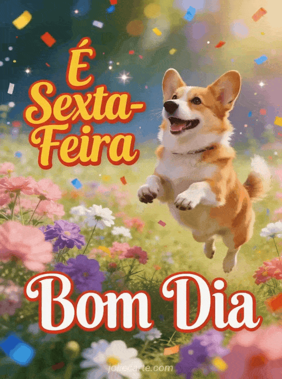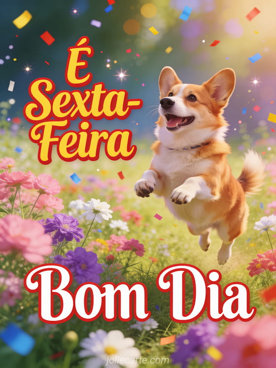 Celebre o fim de semana com este alegre cartão de sexta. Um corgi feliz pula de alegria em um campo de flores silvestres coloridas em uma atmosfera festiva de celebração. Descubra também um cartão gif divertido de sexta ou um cartão de bom dia sexta beijos.
