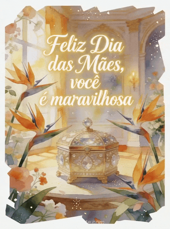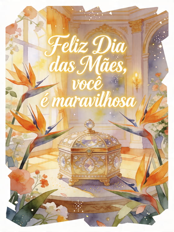 Envie um elogio para o Dia das Mães com caligrafia luminosa, cores quentes em aquarela e aves do paraíso ao redor de uma caixa de joias ornamentada em um salão de primavera iluminado pelo sol. Este cartão admirativo diz você é maravilhosa com elegância e carinho. Veja também como desejar feliz Dia das Mães para sua mãe, cartão Dia das Mães ou feliz Dia das Mães para uma mãe falecida.
