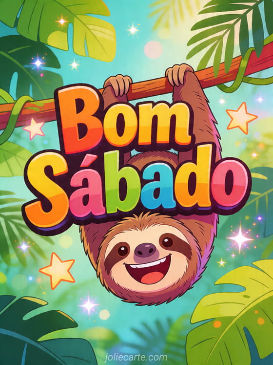 Compartilhe um divertido Bom sábado com este cartão grátis que mostra um bicho-preguiça engraçado pendurado de cabeça para baixo entre folhas tropicais em uma selva de desenho. Você também pode descobrir bom sábado e bom fim de semana citação, bom sábado dezembro ou feliz sábado beijos flores.
