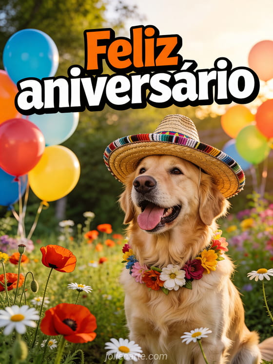 Envie este engraçado cartão de feliz aniversário com cachorro — um golden retriever fotorrealista com sombrero mexicano e colar de flores num jardim de papoulas e margaridas. Descubra também um gif engraçado de feliz aniversário ou um gif animado engraçado de feliz aniversário.