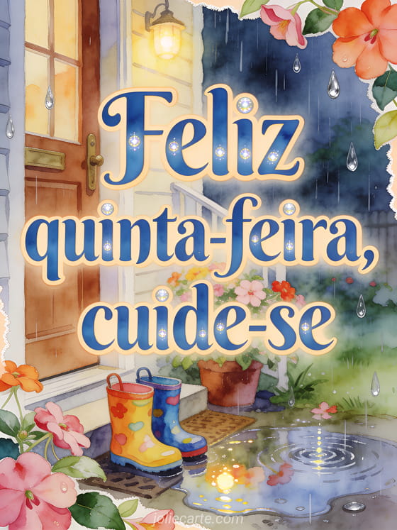 Compartilhe um cartão atencioso de feliz quinta-feira com uma entrada na chuva, botas de chuva coloridas, impatiens floridos e poças brilhantes. Você também pode enviar quinta-feira agradável beijos, belas imagens para feliz quinta-feira ou uma feliz quinta-feira ensolarada imagem.
