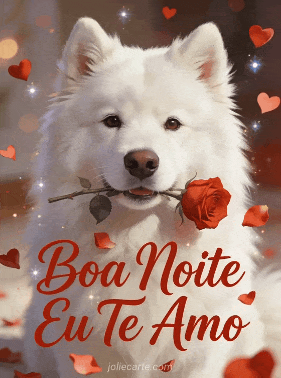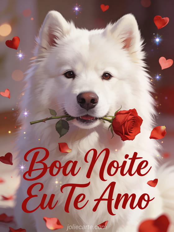 Envie este romântico cartão de boa noite com um fofo cachorro Samoieda branco de expressão amorosa segurando uma rosa vermelha na boca em uma atmosfera de sonho com partículas de luz brilhante. Uma forma doce de dar boa noite ao seu amor. Descubra também um cartão animado de boa noite amor ou um cartão romântico de boa noite.