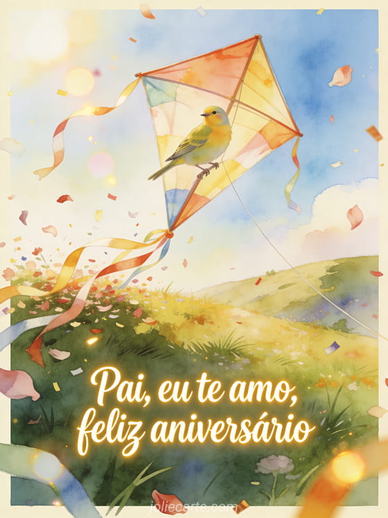 Compartilhe uma mensagem de eu te amo feliz aniversário pai com uma campina ensolarada em aquarela, um pássaro serin pousado em uma pipa festiva gigante e fitas, pétalas e confete passando pela borda. Você também pode enviar aniversário do papai, desenho aniversário papai ou sua filha feliz aniversário papai da sua filha.
