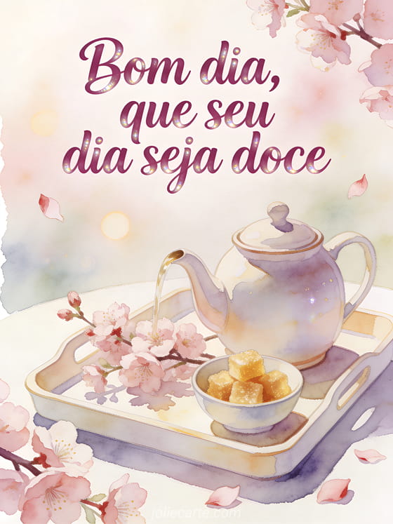 Envie um suave cartão de bom dia com um bule de cerâmica servindo ao lado de ramos de cerejeira em flor e uma pequena tigela de cubos de açúcar dourados sobre uma bandeja de café da manhã. Descubra também uma uma mensagem de bom dia para sua amada, uma mensagem de texto de bom dia ou uns cartões de bom dia.