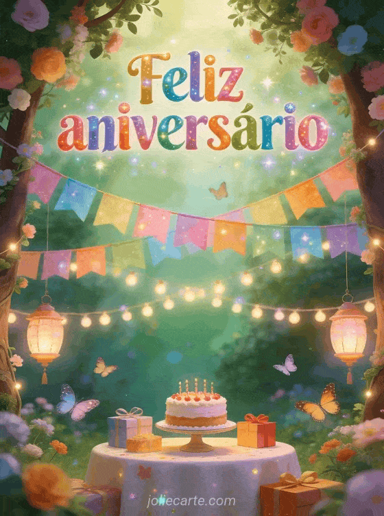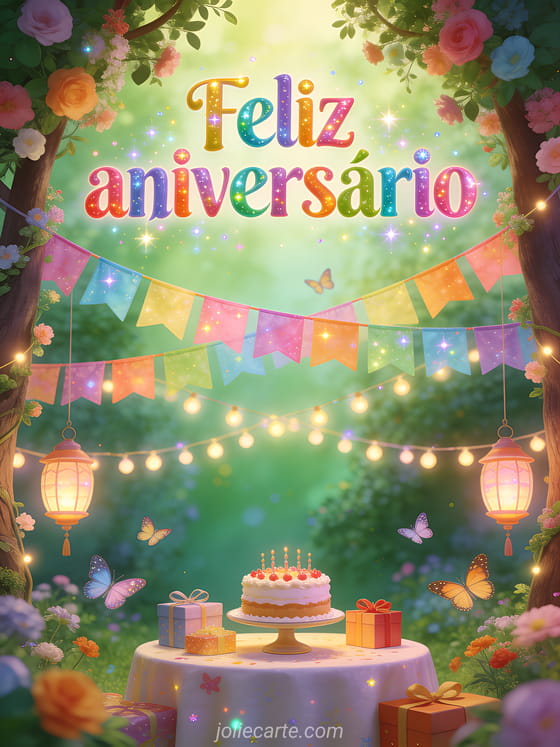 Comemore com este cartão de faixa feliz aniversário bebê com bandeirola colorida entre árvores floridas, guirlandas luminosas, borboletas, bolo e presentes em um jardim mágico. Você também pode ver feliz aniversário bebê gif, cartão feliz aniversário bebê e mensagem aniversário criança engraçada.