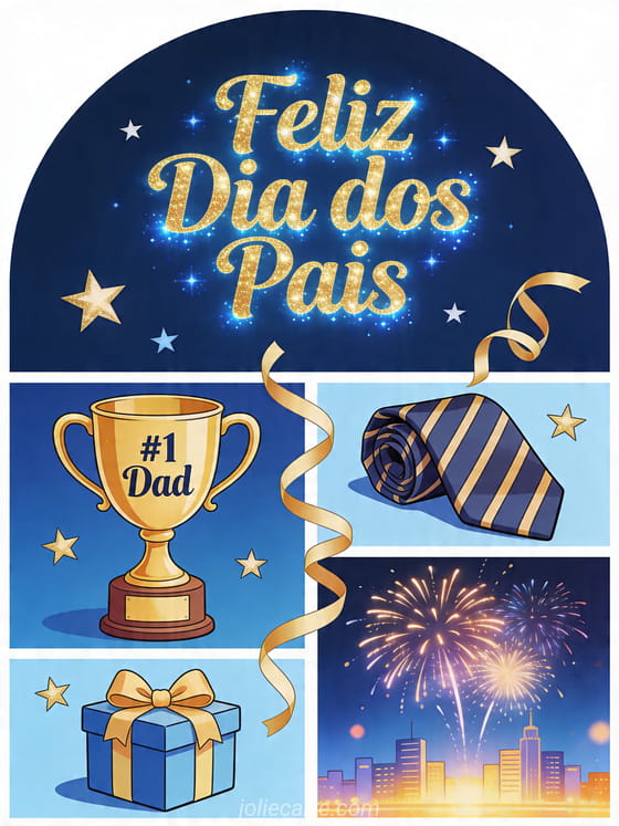 Celebre o papai com um cartão ilustrado e vibrante de Dia dos Pais, com uma xícara troféu, gravata dobrada, caixa de presente e uma cidade iluminada sob fogos de artifício. Este design festivo traz energia e alegria para o dia. Veja também feliz Dia dos Pais papai cartão, palavras doces Dia dos Pais ou desejar feliz dia dos pais a um amigo.