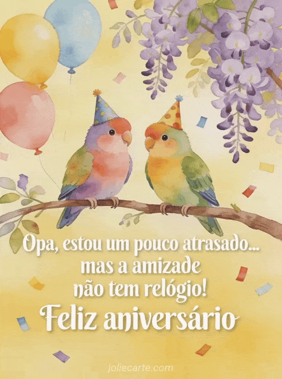 Envie um alegre cartão de aniversário atrasado para um amigo com periquitos divertidos e confete. Descubra também uma mensagem de feliz aniversário atrasada ou feliz aniversário atrasado gif.