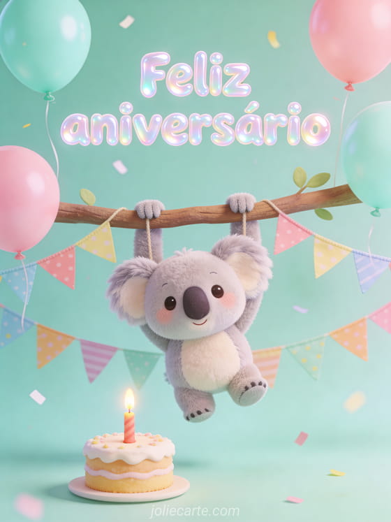 Celebre o aniversário de uma criança com este cartão kawaii com um adorável coala. Descubra também um cartão aniversário fofo ou um cartão aniversário mágico.
