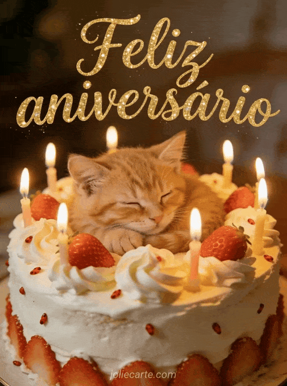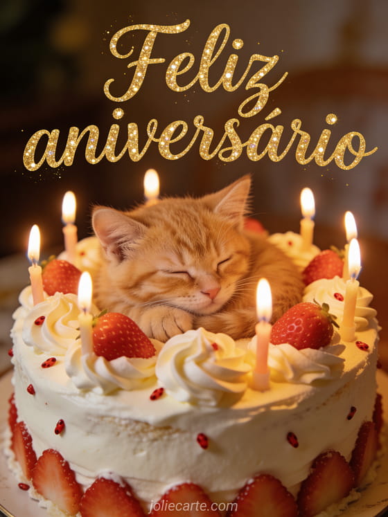 Um emocionante cartão com um gatinho ruivo dormindo em cima de um bolo de aniversário com velas e morangos. Descubra também um cartão feliz aniversário adolescentes, um cartao aniversario adolescente menina ou uma imagem aniversário adolescente.