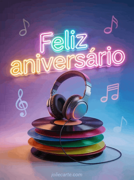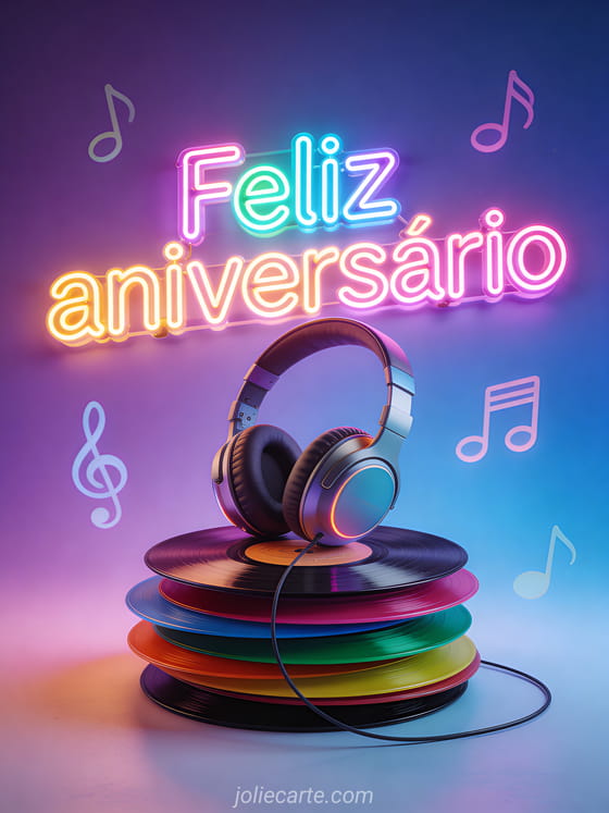 Um cartão de aniversário tão legal quanto o adolescente que você está celebrando. Letras luminosas multicoloridas estilo LED, fones de ouvido sobre uma pilha de vinis coloridos e notas musicais flutuando sobre fundo degradê roxo e azul. Descubra também um cartão aniversário adolescente ou uma mensagem aniversário para adolescentes.