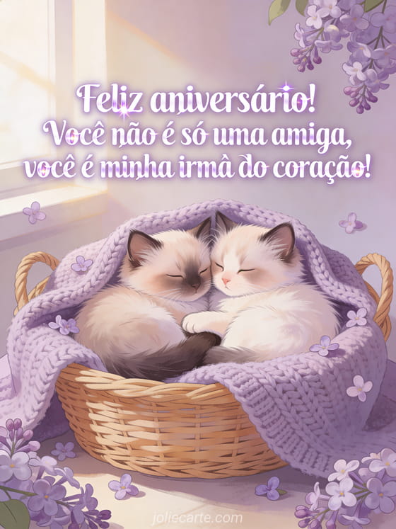 Celebre o aniversário da amiga especial que é como uma irmã do coração com esta ilustração de dois gatinhos ragdoll. Descubra também um cartao aniversario minha namorada, uma mensagem de aniversário parceiro ou uma bela mensagem de aniversário para uma amiga.