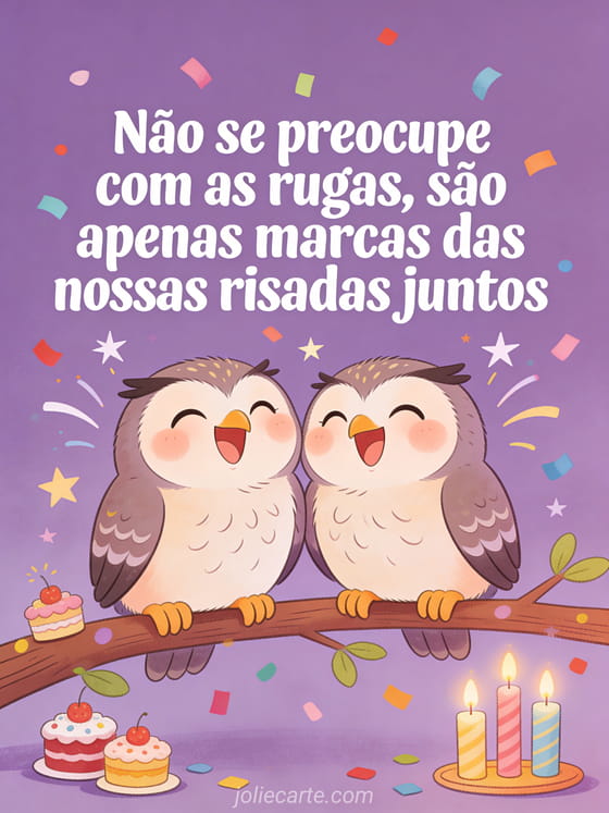 Faça uma amiga rir no aniversário com este divertido cartão com duas adoráveis corujas lado a lado em um galho que parecem rir às gargalhadas, confetes coloridos, estrelas e bolinhos com velinhas. Descubra também um cartão de aniversário para amiga ou um cartão de amizade com pôr do sol.