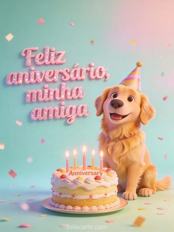 Faça sua amiga sorrir no aniversário dela com este encantador cartão com um adorável cachorro golden retriever de chapéu de festa, sentado na frente de um bolo decorado com velas, rodeado de confetes sobre fundo pastel. Descubra também um desejo aniversário amiga ou um feliz aniversário amiga como irmã.
