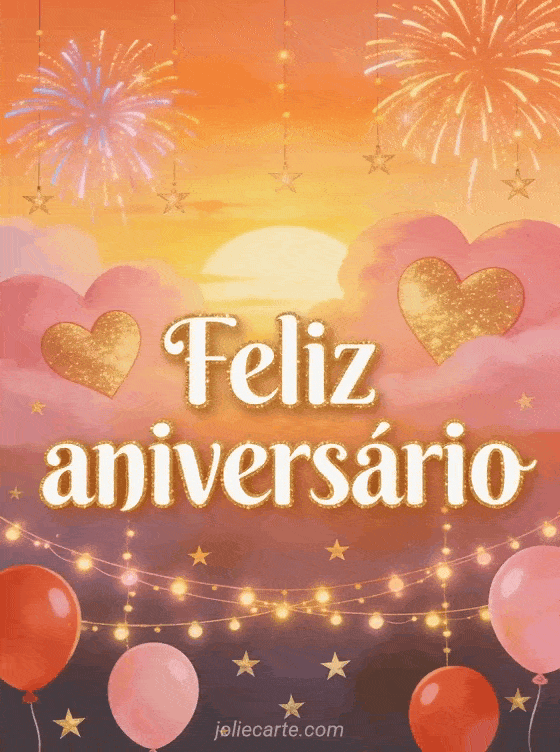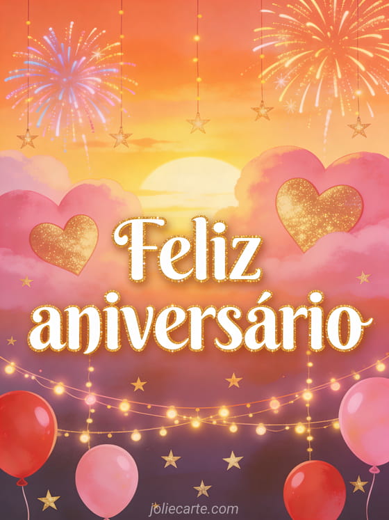 Envie uma mensagem de aniversário romântica com um céu ao pôr do sol cheio de nuvens rosadas e douradas em forma de coração. Fogos de artifício coloridos, cordões de luzes, balões vermelhos e rosados e estrelas douradas criam uma ilustração festiva. Veja também feliz aniversário minha vida, feliz aniversário meu amor ou feliz aniversário minha querida.
