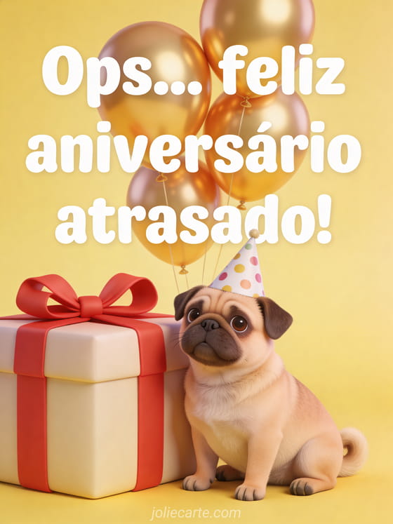 Ops! Envie este fofo cartão de aniversário atrasado com um adorável pug, balões e presentes. Descubra também um cartão festivo de aniversário atrasado ou um cartão de aniversário atrasado divertido.