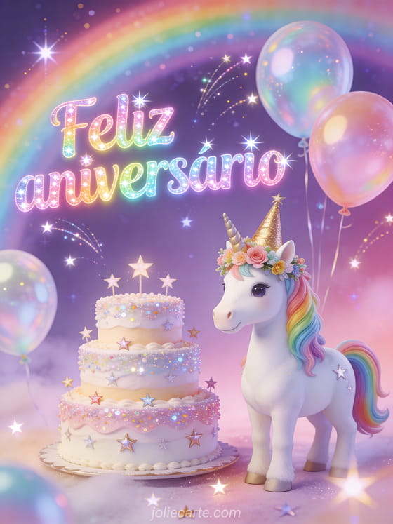 Torne mágico o aniversário de uma criança com este cartão de conto de fadas com unicórnio arco-íris. Descubra também um cartão aniversário bebê ou um cartão aniversário infantil.