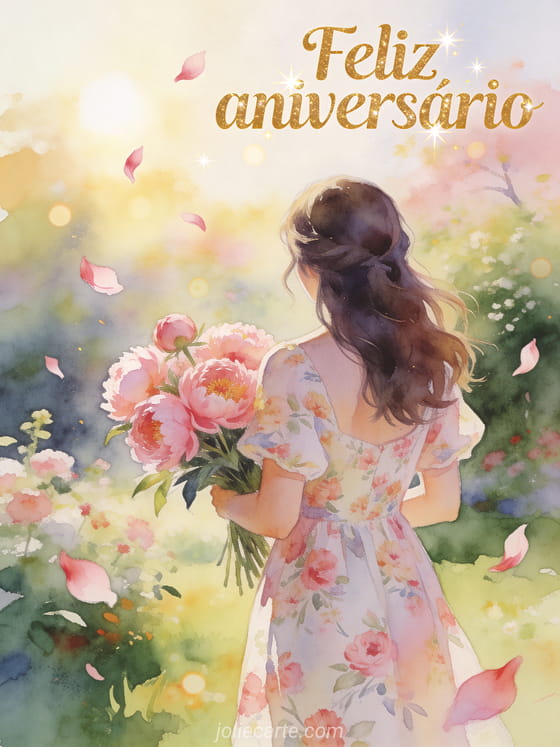 Compartilhe um cartão delicado de aniversário com letras douradas elegantes, uma jovem vista de costas em um jardim primaveral luminoso, vestido floral, peônias rosas, pétalas ao vento, luz dourada da manhã e bokeh suave em aquarela. Você também pode enviar feliz aniversário mamãe imagens, um cartão de aniversário mamãe eu te amo ou feliz aniversário mãe imagens.