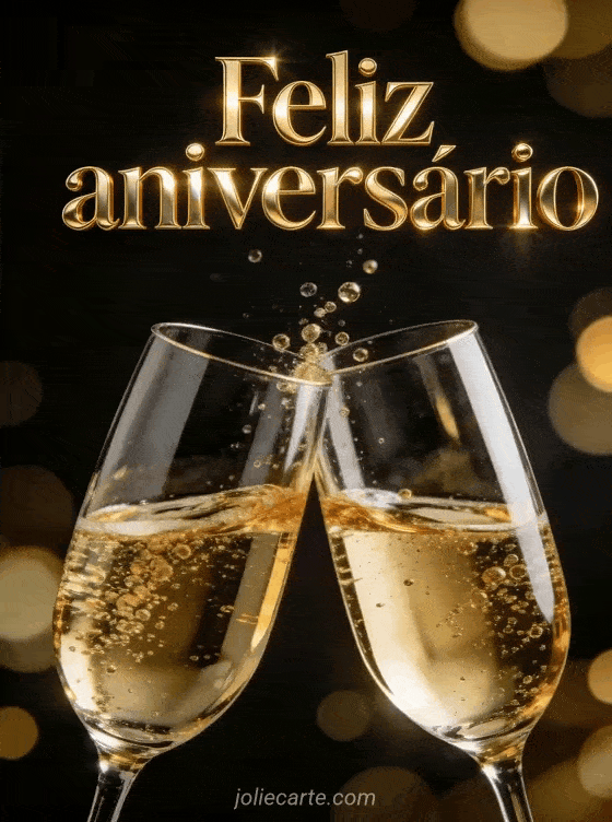 Compartilhe uma glamorosa celebração de aniversário com duas taças de champanhe brindando e bolhas douradas sobre um fundo negro profundo. Descubra também feliz aniversário nossos melhores votos ou feliz aniversário flores.