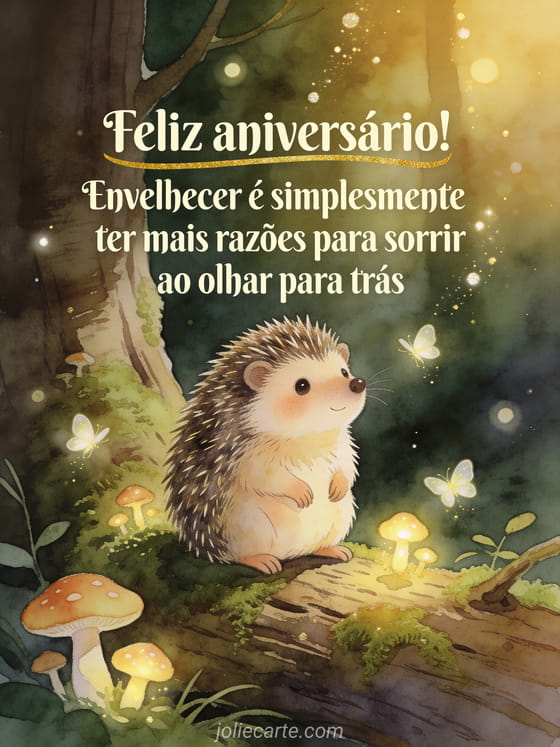 Compartilhe uma bela citação de aniversário com um ouriço mágico rodeado de cogumelos luminosos e vagalumes numa floresta encantada. Descubra também citação para meu aniversário ou pensamentos positivos frase otimista aniversário.