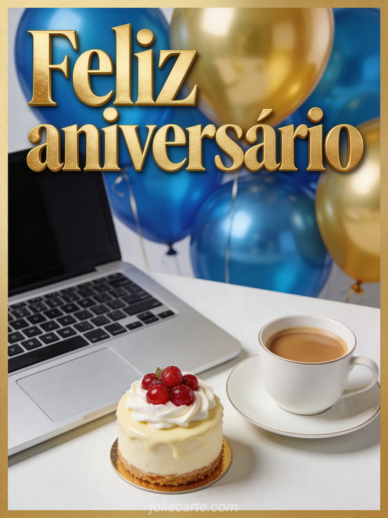 Envie uma mensagem alegre de aniversário para um colega de trabalho com uma cena de escritório bem cuidada, um bolo pequeno, café e balões azuis e dourados. Você também pode enviar um feliz aniversário chefe para outro cumprimento profissional.